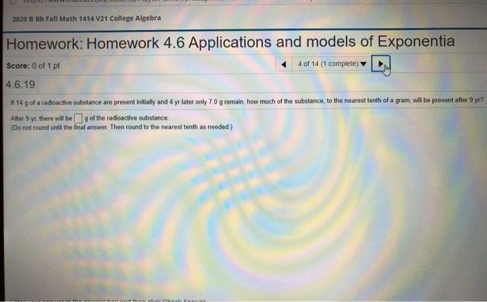 Math 1414 - V17 - College Algebra Co-Requisite - Schedule of Requirements - Spring 2021pdf 5 pages Euclid of Alexandria The Father of Geometrydocx. 0 of 1 pt 4 of 14 1 complete 4619 W 14 g of a radioactive substance are present initially and 4 yr later only 70 g remain how much of the substance to the nearest tenth of a gram will be present after 9 yr. Math 1314 College Algebra.
